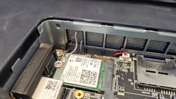 Как видно на фотографиях выше, места для установки модулей SODIMM и SSD Corsair P3 Plus 2TB PCIe 4.0 NVMe вполне достаточно, поэтому при желании его можно заменить. IT15 позволяет установить второй NVMe SSD, если его длина не превышает 42 мм. Расположение Wi-Fi модуля также не помешает установке внутренних компонентов, так как антенна размещена внутри корпуса, а не приклеена к задней панели.