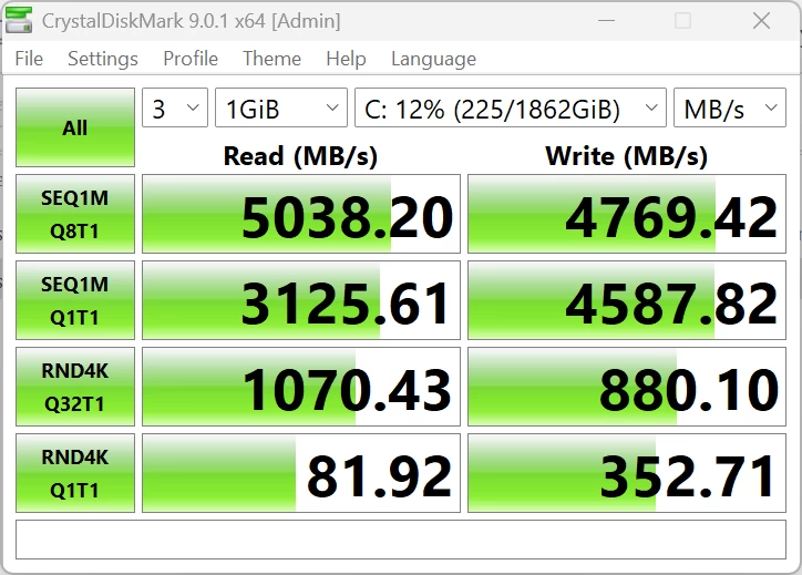 IT15 поставляется с SSD Crucial P3 Plus (CT2000P3PSSD8) емкостью 2 ТБ, и он легко превышает заявленные производителем скорости чтения/записи 5000/4200 МБ/с. Отличные новости!