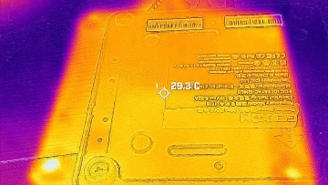 При этом внешняя оболочка не нагревалась выше 34,2 °C. Нижняя часть мини-ПК продемонстрировала более равномерную температуру – 29,3 °C по всей поверхности, в то время как на верхней части тепло больше концентрировалось в задней части корпуса.