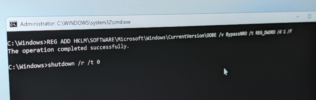 reg add HKLM\SOFTWARE\Microsoft\Windows\CurrentVersion\OOBE /v BypassNRO /t REG_DWORD /d 1 /f