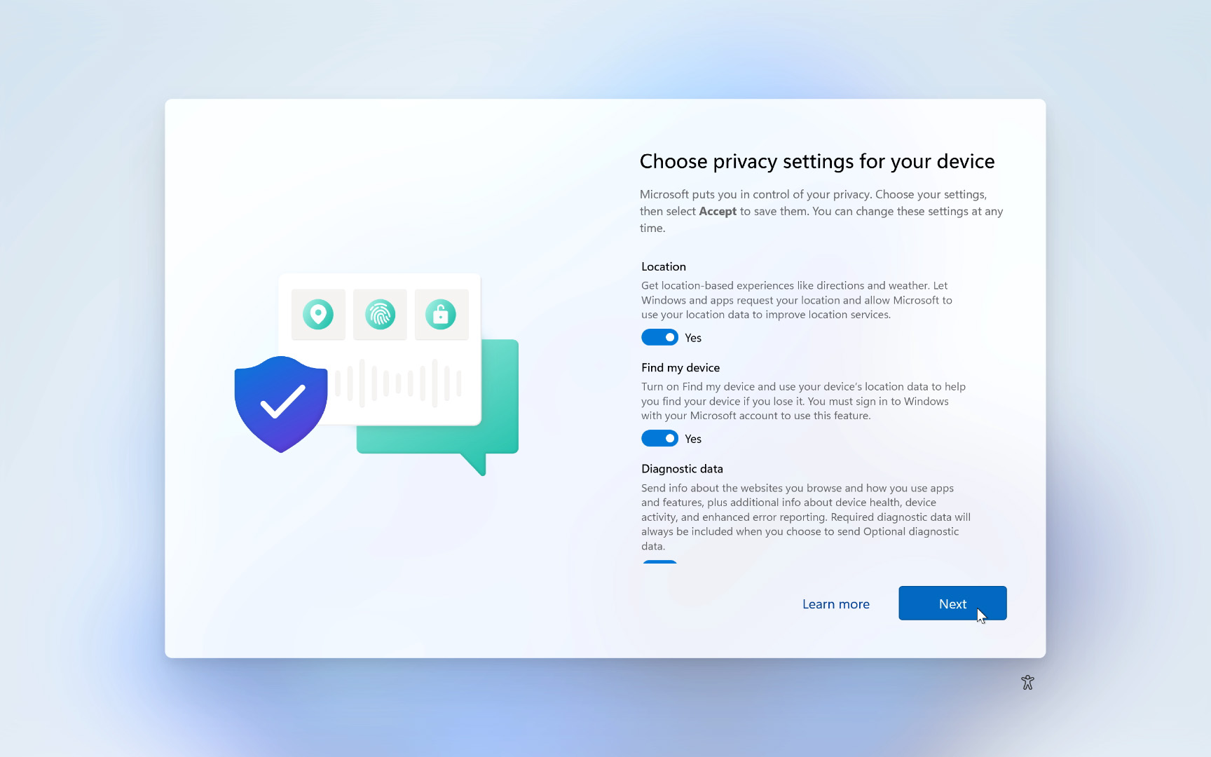 Телеметрия и отслеживание местоположения включены по умолчанию, но их можно легко изменить позже. Телеметрия и сбор "дополнительных диагностических данных" – это еще одна тема, которая постоянно вызывает вопросы. Майкрософт просит собирать информацию о том, какие сайты вы посещаете и как используете приложения. Плюс, по умолчанию включено отслеживание местоположения, даже если у вас стационарный ПК. 🤦♂️